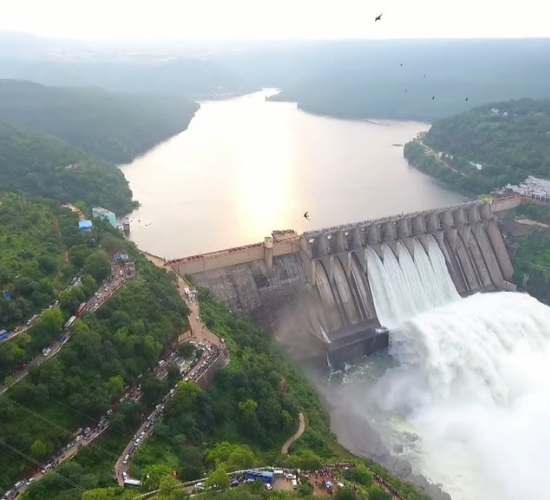 The Srisailam Dam is constructed across the Krishna River in Nagarkurnool district, Telangana and Nandyal district, Andhra Pradesh near Srisailam temple town and is the 2nd largest capacity working hydroelectric station in India.